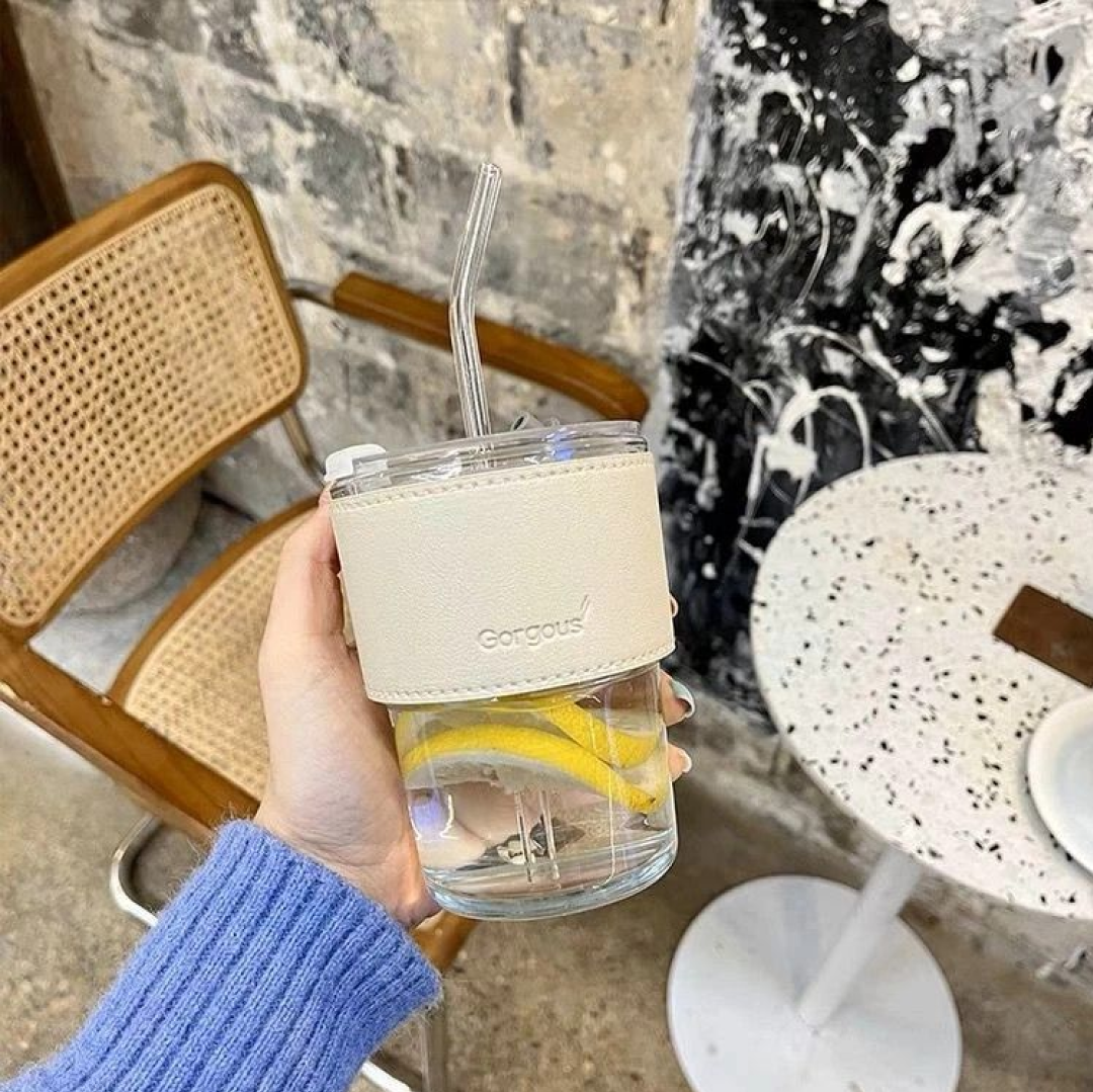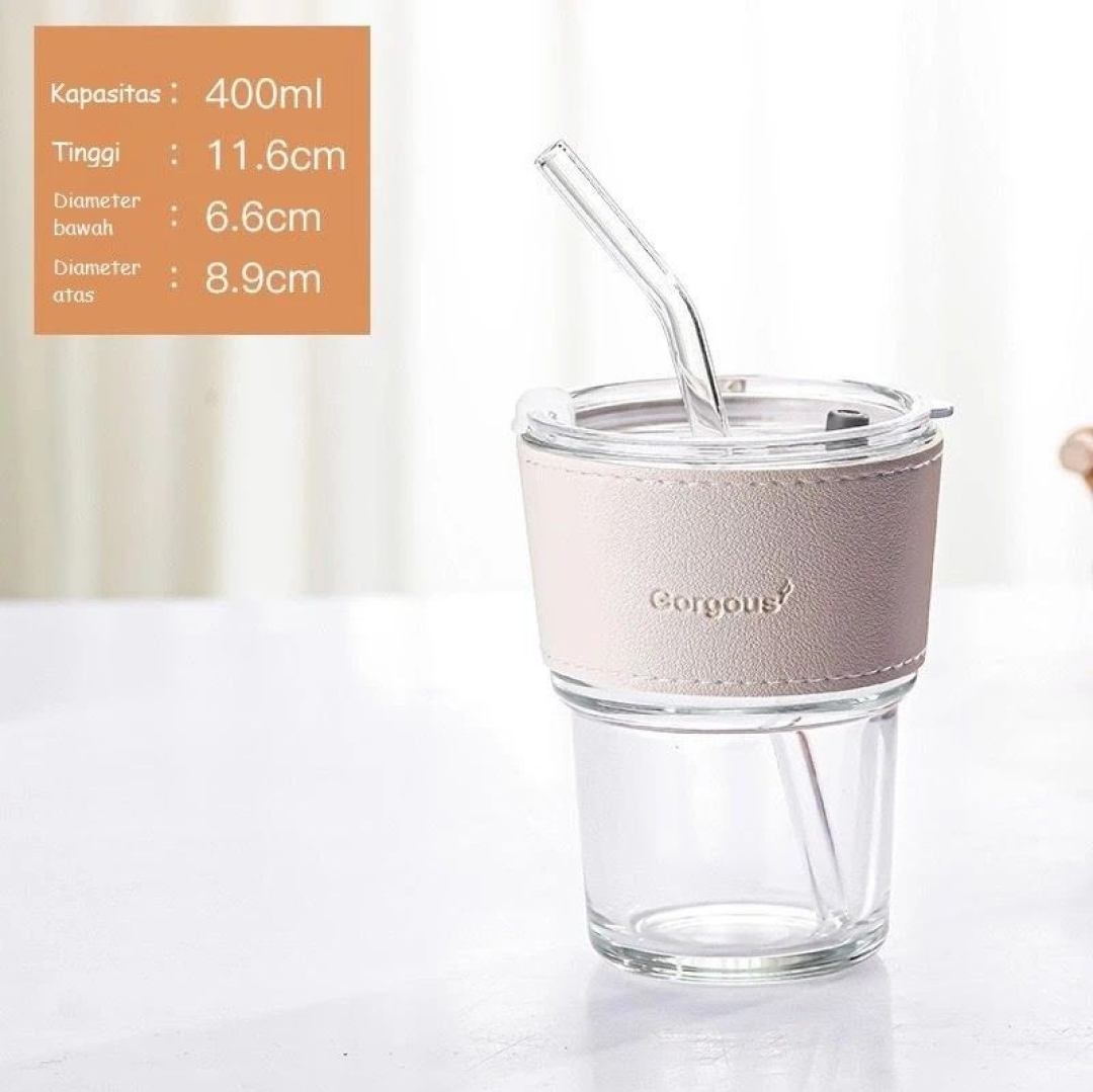 Gelas kaca gorgous estetik dengan design unik dan menarik yang membuat gelas unik ini memberikan kesan elegan dan higienis. sudah dilapisi karet anti panas dan juga dilengkapi dengan sedotan yang membuatnya praktis dibawa kemana-mana. Dilengkapi tutup yang ada karetnya sehingga tutup tidak gampang lepas. sangat cocok dibuat untuk minum kopi, teh, susu, minuman panas maupun minuman dingin. DESKRIPSI - Desain Aesthetic, Elegan, dan Sederhana. - Tumbler + Sedotan bahan kaca - Desain tutup yang elegan, bisa dipasang sedotan - Sedotan bahan kaca - Kapasitas 400 ml - Body full kaca, anti letoy, anti peyot. - Praktis, mudah di gunakan dan dapat di bawa kemana-mana. - Tutup yg aman untuk minuman berstandar food grade PP. - Cocok untuk minum Teh, Coffee, Milk, Juice, dll - Sedotan putih tidak berwarna bening akan di sesuaikan stok Material Body - Glass Tutup - Plastik PP Straw - Glass Seal - Silikon Dimensi P x L : 11 x 9 cm Diameter bawah 7 cm FEATURES 1pcs tumbler gelas 1pcs tutup 1pcs sarung gelas + free 1 sedotan